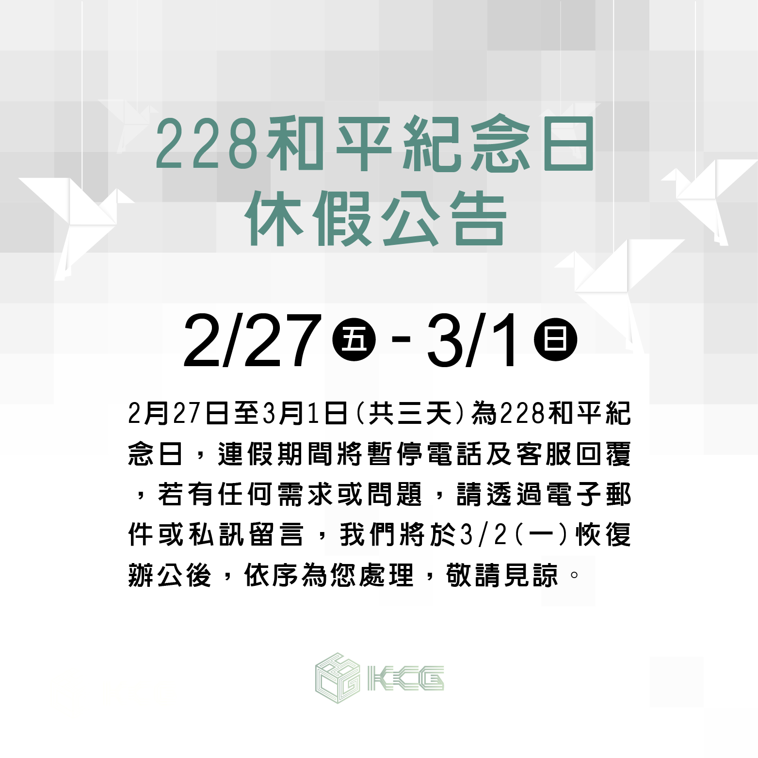 2/27(五)~3/1(日)為228和平紀念日假期
