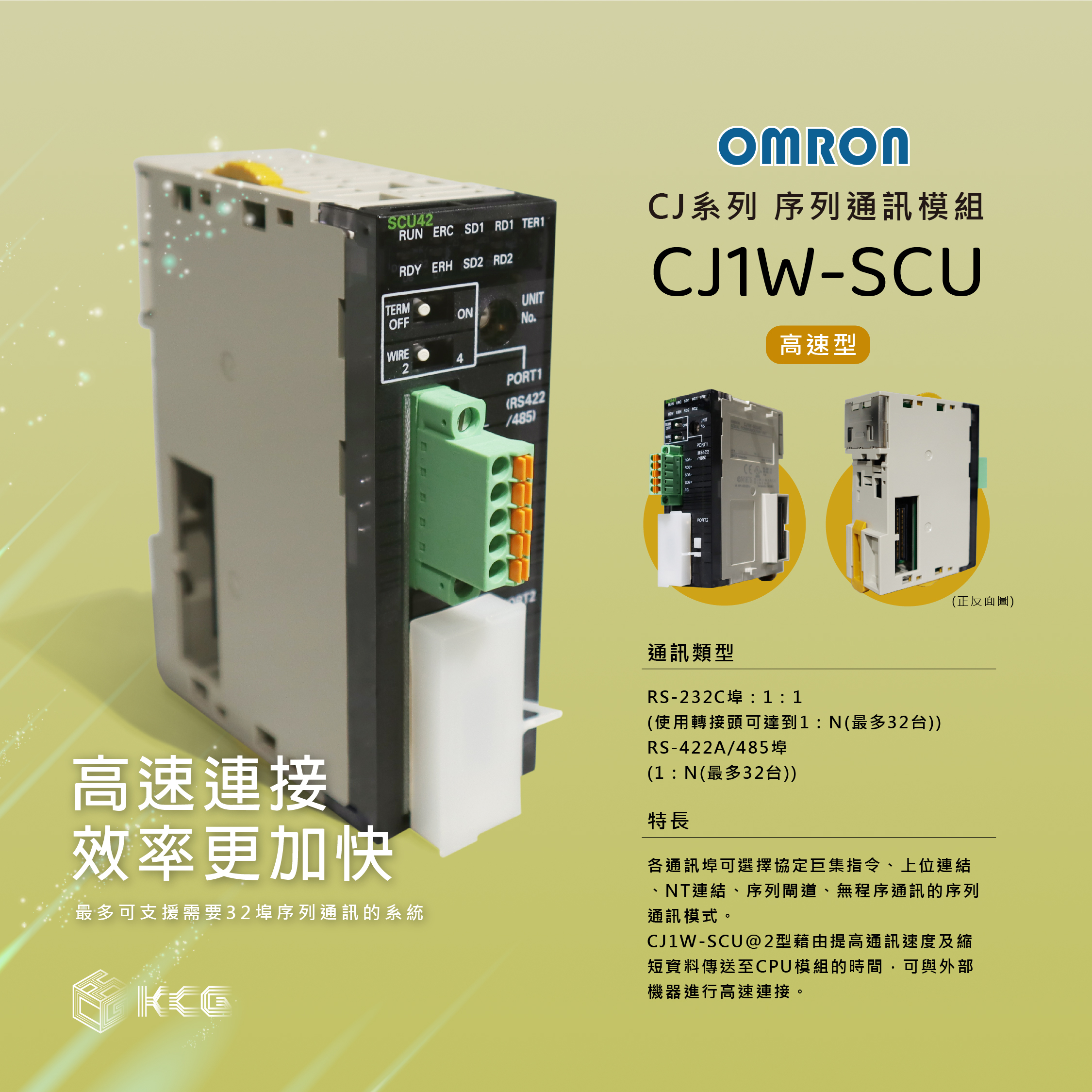 Loại CJ1W-SCU @ 2 cho phép kết nối tốc độ cao với các thiết bị bên ngoài bằng cách tăng tốc độ truyền thông (lên đến 230,4kbps) và rút ngắn thời gian truyền dữ liệu đến mô-đun CPU.